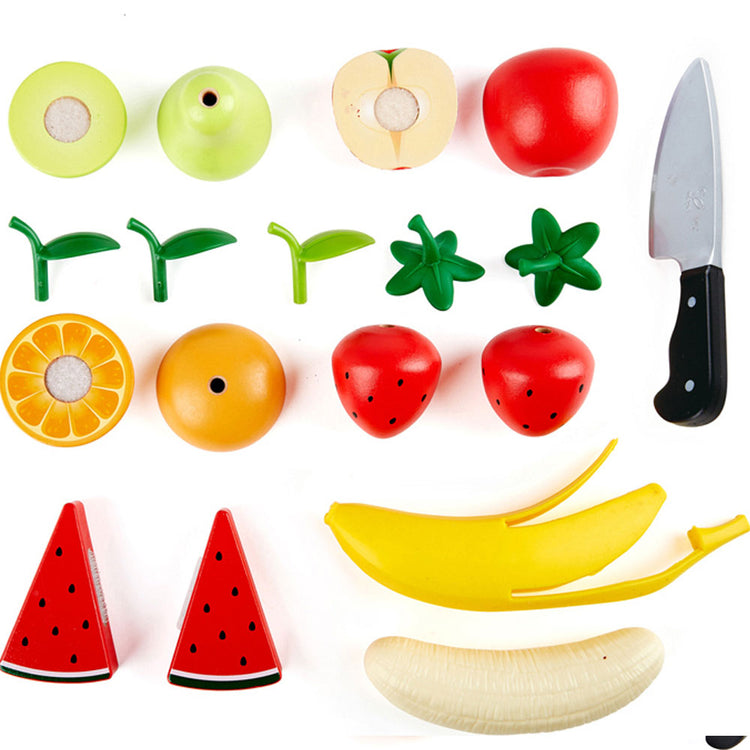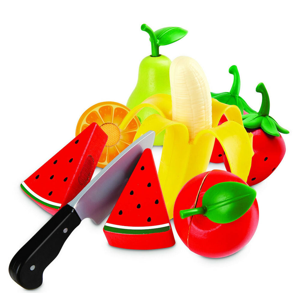 Συνηθίστε να τρώτε υγιεινά με αυτό το χαριτωμένο σετ φρούτων. Περιλαμβάνει ένα ρεαλιστικό μαχαίρι παιχνιδιού, αποφλοιωμένη μπανάνα, δύο φράουλες, ένα αχλάδι, ένα πορτοκάλι, ένα μήλο, με αφαιρούμενους μίσχους και μια φέτα καρπούζι, τα οποία μπορούν να τεμαχιστούν.