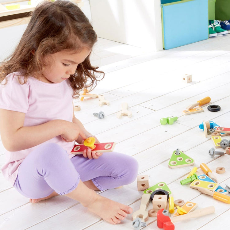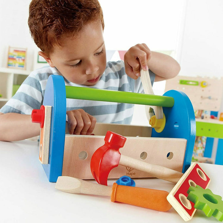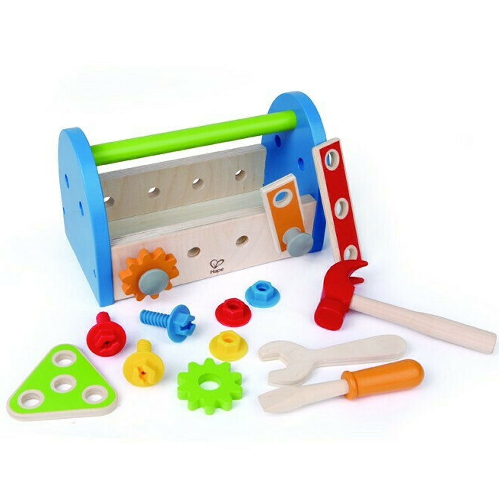 Ξύλινο καλαθάκι εργαλείων Fix-It Toob Box σε σετ 17 τεμαχίων από τη Hape, που περιέχει παξιμάδια, μπουλόνια, και όλα τα εργαλεία που χρειάζονται οι μικροί οικοδόμοι όλα συσκευασμένα σε ένα κασελάκι.