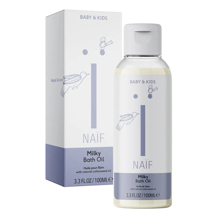Βρεφικό και παιδικό λαδάκι μπάνιου Milky Bath Oil από την Naif. Ενυδατώνει το δέρμα του μωρού σας και μαλακώνει το νερό του μπάνιου, χωρίς να γλιστράει το μωρό σας! Θρέφει το δέρμα με φυσικά συστατικά όπως το λινέλαιο, καθιστώντας το κατάλληλο για το ευαίσθητο βρεφικό δέρμα.