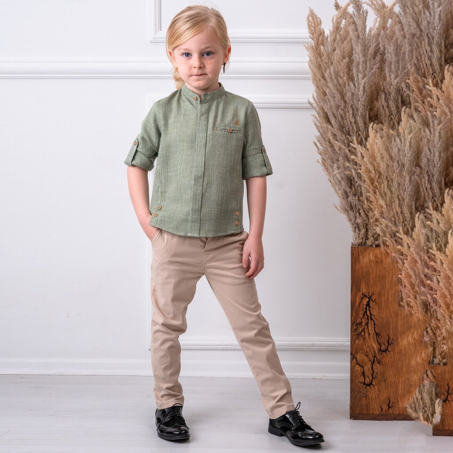 Μοντέρνο πουκάμισο χωρίς γιακά, μακριά μανίκια με κουμπιά και παντελονάκι τσίνο με τσέπες. Σύνθεση από 100% βαμβάκι.