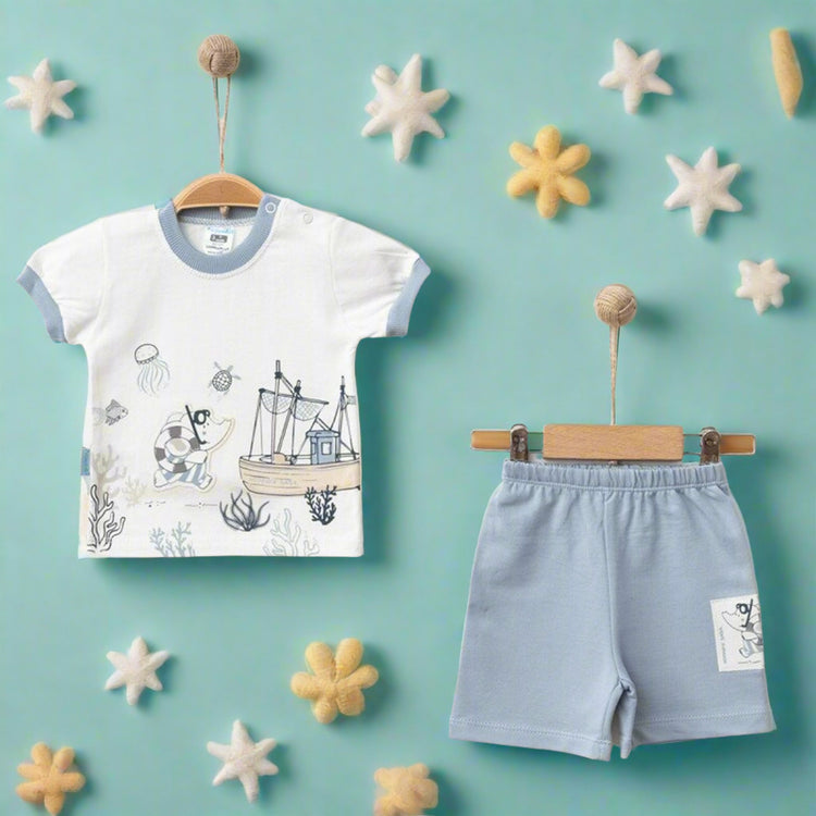 Βρεφικό σετάκι με μπλουζάκι με όμορφα σχέδια και βερμουδίτσα, από την καλοκαιρινή συλλογή του Arfie.gr. Σύνθεση από 100% βαμβάκι.