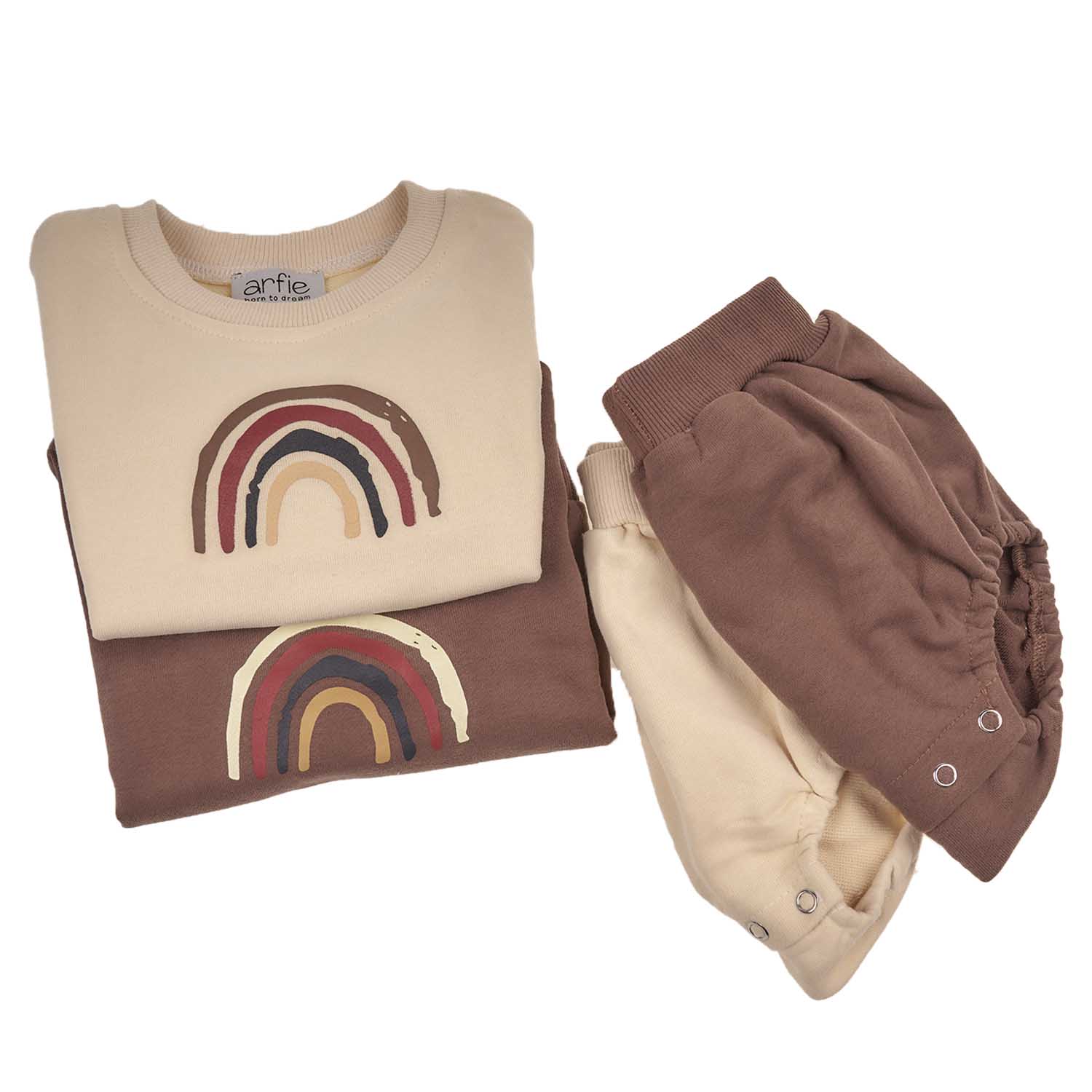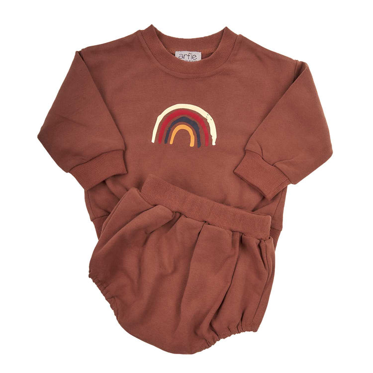 Σετάκι ρούχων με φούτερ και bloomers Rainbow από το Arfie, από 100% βαμβάκι. Φαρδιά γραμμή φούτερ με διακοσμητική στάμπα ουράνιο τόξο σε γήινους τόνους και φαρδύ σορτσάκι με λάστιχο στη μέση και στο τελείωμα. Ευκολία κινήσεων για το μικρό σας και απαλή σύνθεση από βαμβάκι για ένα μοντέρνο και άνετο look.