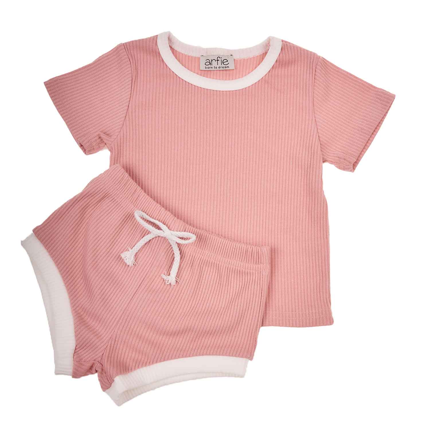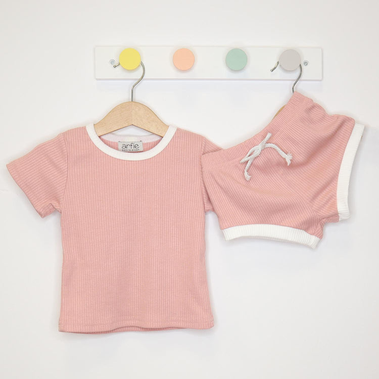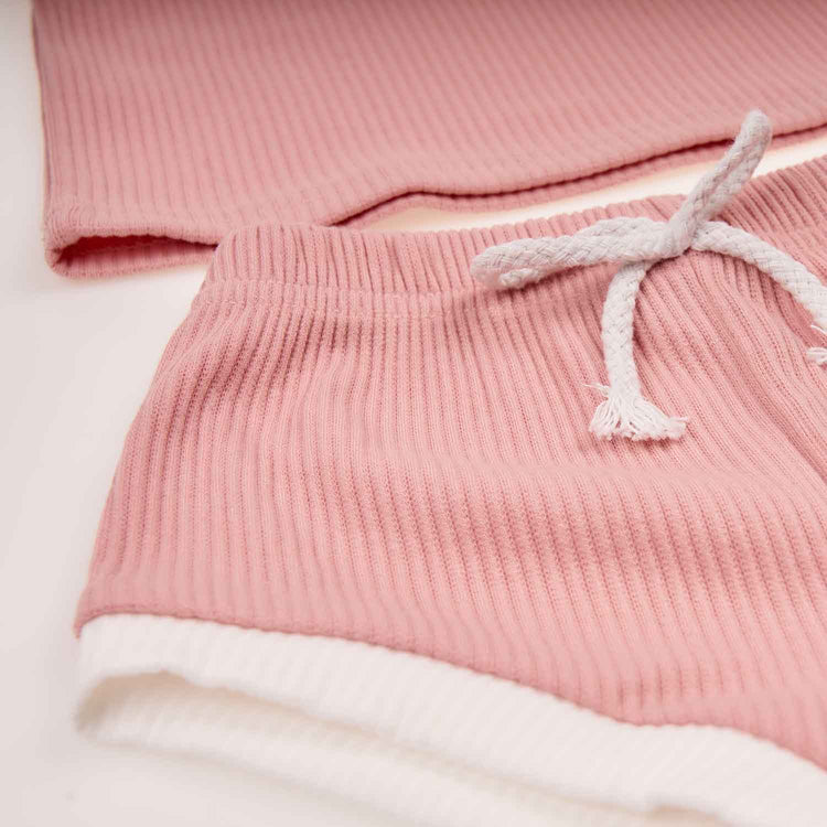 Βρεφικό σετάκι ρούχων με μπλουζάκι και σορτς σε rib ύφανση από 100% ελαφρύ οργανικό βαμβάκι. Με μαλακό και απαλό ύφασμα για το δερματάκι του μωρού και διακοσμητικό κορδόνι στη μέση και λευκή ρίγα στα τελειώματα.